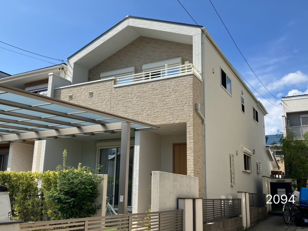 | 外壁使用塗料 | 外壁メイン:関西ペイントダイナミックトップ 色:クールホワイト 外壁木目調:関西ペイントダイナミックトップ 色:リーガルブラウン 外壁石彫:キクスイSPパワーフッ素クリヤー 色:クリヤー 屋根:キクスイSPパワーサーモSI 色:ナポリブラウン |