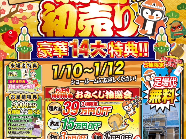 名古屋市守山区・名古屋市名東区 外壁塗装専門店有水塗装店の外壁塗装ブログをお読みくださり、誠にありがとうございますo(〃^▽^〃)o 名古屋市守山区・名古屋市名東区を中心に、品質保証の外壁塗装・屋根塗装・雨漏り工事をご提供しております!! 引き続きブログをお読みいただき、より良い外壁塗装・屋根塗装・雨漏り工事にして頂きたいです(/≧▽≦)/⭐ 新年あけましておめでとうございます。 本年も有水塗装店をよろしくお願いいたします🔅 今年も開催したします! 🎍 新春!初売りイベント🎍 そろそろ外壁しようか迷っている方いませんか? 壁を触ると白粉がつく、外壁にひびが入ってる、外壁の色が薄くなったような気がする・・・ そんな症状もしかしたら、外壁塗装のタイミングかもしれません🤔 外壁は大丈夫でも、実は目に見えない屋根など劣化箇所があることも💦 今回のイベントを機にぜひお話だけでも聞いてみてください!(*/ω\*) 日付は 2026年 1月 10日 (土) ~ 1月 12日 (月) 🔆 営業時間・・・9時~17時 🔅 場所・・・守山名東店ショールーム(名古屋市守山区小幡南2-2-1) https://maps.app.goo.gl/iYn26B3nBKJB1xHh6 駐車場完備!🚙大きなペンギンの看板が目印です🐧✨ 尾張旭店ショールーム(尾張旭市北原山町六田池2255-1) https://maps.app.goo.gl/yoSMh64SJXPsqGLf8 駐車場完備!🚙大きなペンギンの看板が目印です🐧✨ 瀬戸店ショールーム(愛知県瀬戸市汗干町4-1) https://maps.app.goo.gl/yoSMh64SJXPsqGLf8 提携パーキングあり!🚙大きなペンギンの看板が目印です🐧✨ お正月特典含め14大特典をご用意しております🌟🌟 外壁塗装・屋根リフォームを検討されている方、イベントが気になる方など、ぜひご家族でお待ちしておりますo(* ̄︶ ̄*)o 🎉 豪華17大特典 🎉 🖤 特典➀ Wご来場特典 ご来店いただいた方には、お米をプレゼント!💕 お子様特典はお菓子のつかみ取りもご用意しています✨ ※1家族1セットとなります。 🖤特典② お見積り特典 3,000円分 お見積りのご依頼をしてくださった方には、 上記5種類の中からお好きな3,000円分のギフトをプレゼント!!! ※1家族1セットとなります。 🖤特典③ ご成約特典 10,000円分ギフト ご成約をいただいた方にはなんと10,000円分ギフトをお渡しします! 上記5種類からお好きなものをお選びください✨✨ ※1家族1セットとなります。 ※100万円以上のご成約の方限定となります。 🖤お正月特別特典!おみくじ抽選会 お正月特別特典は、おみくじ抽選会です!! 超大吉は39万円のお値引きが入ります!! 他も15万、3万、1万とハズレなしの抽選会になっていますので、ぜひ挑戦してみてください⭐ ※足場代無料と併用はできまでん。 ※100万円以上のご成約の方限定となります。 🖤足場代無料キャンペーン 最後に有水塗装店からのお年玉で足場代無料にしちゃいます!! ただし3棟限定!先着順となります! 屋根・外壁塗装をご検討されている方大チャンスです! ※ガラガラ抽選会と併用はできません。 ※100万円以上のご成約の方限定となります。 本日も名古屋市守山区・名古屋市名東区 外壁塗装専門店有水塗装店の外壁塗装ブログをお読みくださり、誠に有難うございました(❀ᴗ͈ˬᴗ͈) ⁾⁾ 外壁塗装のご質問等がございましたらお気軽に名古屋市守山区・名古屋市名東区 外壁塗装専門店有水塗装店へお問い合わせください。 ⇩施工事例⇩ https://arimizutoso.jp/works/19953/ ⇩営業時間は9時00分~17時00分⇩ 0120-716-710 ⇩お見積りは無料で行っておりますのでお気軽にお問い合わせください♪(❛ᴗ❛ و(و˚˙ [contact-form-7 id="1253" title="お見積り・お問い合わせフォーム"]イベント・キャンペーン