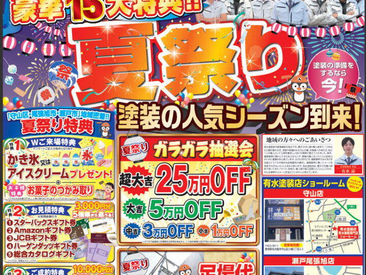 尾張旭市・瀬戸市の屋根・外壁塗装専門店、有水塗装店です!!いつもブログをお読みいただき、ありがとうございます♪ 有水塗装店は尾張旭市・瀬戸市を中心に、品質保証の外壁塗装・屋根塗装・雨漏れ工事をご提供いたしております(. ❛ ᴗ ❛.) 皆様には引き続きブログを拝見いただき、より良い外壁塗装・屋根塗装・雨漏れ工事を出来たらなと考えておりますο(=•ω<=)ρ⌒☆ . 有水塗装店の夏祭りイベント 9月7日(土)~9月9日(月) . 会場は2店舗合同で行います . 瀬戸尾張旭ショールーム 【愛知県尾張旭市北原山町六田池2255-1】 https://maps.app.goo.gl/zA9dFSu6UNm2L6vv8 守山ショールーム 【愛知県名古屋市守山区小幡2-2-3】 https://maps.app.goo.gl/Pxu6C6icfgexNT4JA . ✨豪華15大特典 . ご来場特典 . お見積特典 . ご成約特典 . ガラガラ抽選会 . 足場代無料 . . . . . 本日も尾張旭市・瀬戸市 外壁塗装専門店有水塗装店の外壁塗装ブログをお読みいただきありがとうございました(๑•̀ㅂ•́)و✧ 外壁塗装・屋根塗装・雨漏れ工事のご相談は尾張旭市・瀬戸市 外壁塗装専門店の有水塗装店へお問合せください!!!スタッフブログ