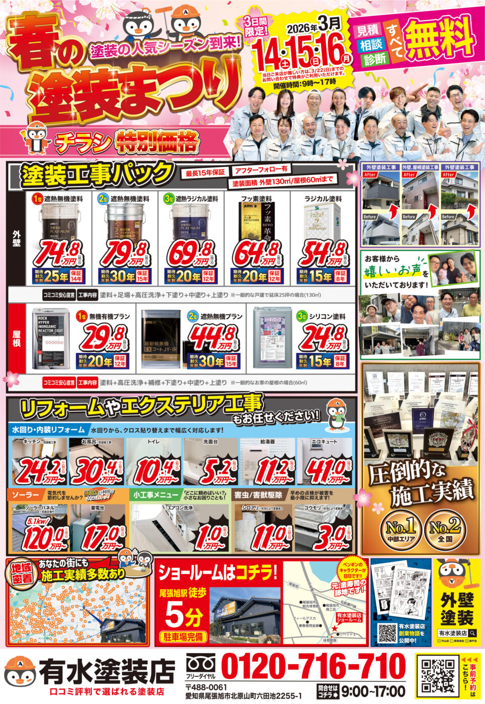 More reviews石橋安徳10:01 08 Jan 26初めての外壁塗装でいろいろと不安がありましたが、営業の方が一つ一つ丁寧に対応してくれたので、有水さんに決めました。今回は屋根、外壁塗装、ベランダの防水をお願いしました。工事が始まり塗装職人さんの細かな気ずかい、仕上がりの美しさに感謝してます。また、その他の職人さんも丁寧な仕事をしていただき感謝してます。足場が外れ改めてわが家を見て感動!有水さんにお願いして、本当に良かったです。今後ともよろしくお願いします。麦とろに一味05:03 14 Dec 25外壁塗装ありがとうございました!営業水谷さんの自然体なスタイルが良い距離感で、ストレス無くコミュニケーションを取れたのが、私の中で好感度大でした。押し付けがましかったり媚びへつらう感じの営業さんはちょっと、、、。言葉の一つ一つが真摯的で説得力があり、また家が好きという想いが伝わってきたのも、大きな信頼に値する方だなぁと。street viewで時間忘れて街ブラ(覗き見?)したのは楽しかったですね笑職人加納さんのお人柄も私に合っていて、ストレス無しでした。オラオラ系や気難しい職人気質だと萎縮してしまうので。個人的に塗装し始めた階段でしたが、カットのサポートをしてくださったり夜露でやられた塗りムラを修正してくださったり、本当にお世話になりました。養生箇所や玄関塗装の工程調整などなど、こちらの無理な注文にも親切丁寧誠実にご対応いただき感謝です。有水さんにお願いして良かった。ありがとうございました!今後も何かと相談しますので宜しくお願いします!木全孝典03:27 10 Dec 25数年前に兄が有水塗装さんでお世話になり、家も塗り替えの時期がきました!他にも3社見積もり最後有水さんと1つ迷う他社がありましたが、値段も融通きかせてくれたのもありますが、何より営業の冨田さんが、恐れ入るくらい仕事熱心で礼儀も正しく、やはりそこが決め手となりお願いすることにしました!同じ様な塗装で5回塗りしてくれる所も有水塗装さんだけでしたねぇー!なので見積もり通りに追加料金も一切無く気持ちよく工事も終われました!工事中は冨田も忙しくなかなかお会い出来ませんが、工事とのやり取りで疑問を持ったり返答に納得出来ない時に、冨田さんに連絡すると、しっかりした説明又は、不安を解消してくれる変更、対応をしっかりしてくれるので大変助かりました!真面目なだけに結構長文ですけどね(笑)そして実際に塗る人の腕がやはり大事な所で、これも兄の家の塗装して頂いた二村さんご指名で行きました!みた感じザ職人って感じの方ですが(笑)話しかけるととても愛想が良く第一印象に好感を持てました!当初外壁の目地の色を変えるか迷っていて目地の色を変えると、上塗りの色がどうしても少し垂れるとの事で、すごーーーく迷ってました!でも外壁が四角い凹凸があるので、せっかくなので生かしたく多少垂れても色を変える事にしました!それが塗り終えると垂れてる所を探すも1つも見つかりません!二村さんに聞くと、どうやらかなりの手間が掛かるけど短い毛のローラーで塗ってくれたそうで!足場の解体期限も一応ある中、だまってそこまで気を使ってやってもらえるとは凄くないですかねぇー!もちろん追加料金無し!よって完成後は、想像以上に満足の行く仕上がりで感謝しかありません!!他の職人さんも良いとは思いますが、個人的には二村さん指名して良かったです!唯一1つあるとすれば、僕も気がつけなかったのですが、側面の白いラインを、窓枠とベランダの下に合わせて太さを調整したのですが、やはり少し太かったかなぁーっと!特に西側はラインじょうに窓が無く線だけなので、少しドテっとした感じに---まぁー許容範囲以内ですけどね!もう少し下の部分を上げて、細くするとスマートなラインになったかも!しかし本当にそこだけ!他にも営業の田村さんをはじめ、色々な職人さんも、愛想良くかつ礼儀正しく本当にお世話になりました!最後に一言、有水塗装さん見積もりだけでもする価値あると思いますよ!ichico ichicco12:44 30 Sep 25先日はお世話になりました。そして暑い中ありがとうございました。塗装をお願いするにあたり、他社からも見積もりをとりましたが金額的には高いほうでした。見積もりの際には外壁だけでなくドローンで屋根の上や築8年でも屋根裏、シロアリ、コウモリ被害など隅々まで確認してくださいました。他社では家の周りを見える範囲のみであったり、築8年だと屋根裏はみなくても大丈夫と確認はしなかったです。営業の富田さんは他社と比べてメリットデメリットなど圧倒的に詳しく説明してくださり何を聞いてもきちんと丁寧にお話ししてくれました。そして家に合わせた塗料の選定や技術力の高さなど富田さんの自信ある話ぶりを聞きお任せしたいなと思いました。職人の二村さんはいつもニコニコ笑顔が素敵な方でした。隣近所の方からも(工事車両で見通しが悪くなってたので)いつも車を出す時交通