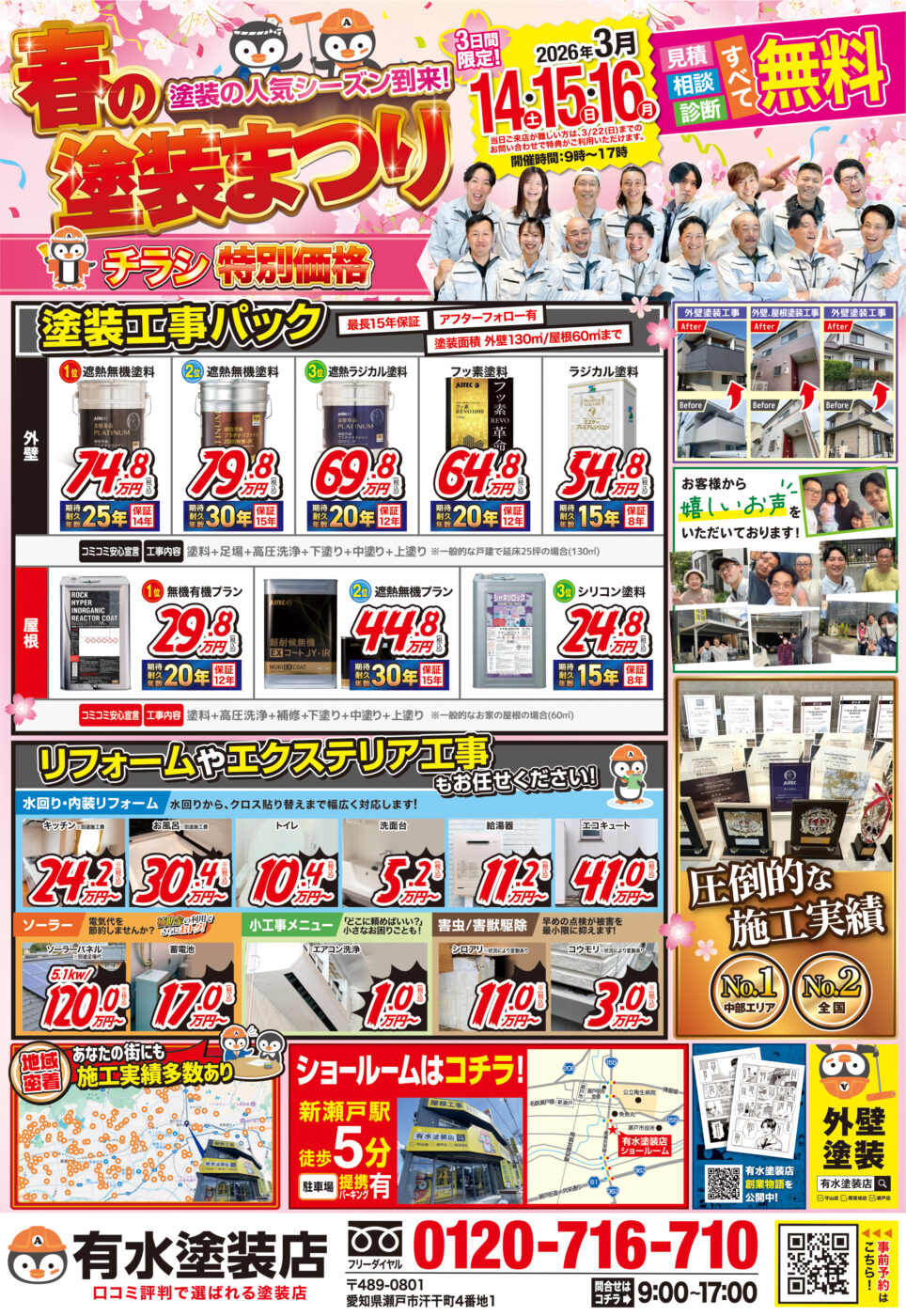 More reviewsぶらり猿投山14:04 31 Jan 26代金支払が終わったのでレビューします■事前調査屋根裏調査、ドローンを使った屋根調査は他社もやっていた(それすらしない業者もいましたが)が、含水計での外壁の含水量調査、外壁下からのコウモリの侵入調査は有水さんのみで、外壁のわずかな浮きを指摘したのも有水さんだけでした。担当のTさんの真摯な対応と豊富な知識が気に入って有水さんに施工をお願いするごとにしました。■仕様決め、見積り作成パソコンで実際の家に色塗りがシュミレーション出来てイメージしやすかったです。塗料について聞いても、それぞれのデメリを説明してもらい決めることが出来ました。金額は高くも安くもなく妥当だと思います。■施工について初日に高圧洗浄機の不具合で、1日ムダになりましたが、その後は丁寧に施工して頂けたと思います。仕上がりもとてもキレイで満足しています。有水さんはシーリングが固まることに気をつかっていて、最短で1週間、家は気温が低かったので10日間明けたので、足場は1カ月設置していました。■アフターフォロー当方は12年保証で毎年1回連絡が来るのと、それ以外でも何かあったら、対応して頂けるとのことです。■まとめ外壁塗装は信頼のおける地元の業者にやって頂くのが良いと思っています。有水さんがベストだとは言い切れませんが、見積り業者の1社に入れることは、強くお勧めします。担当のTさん色々ありがとうございました。今後も宜しくお願い致します。松岡 賢吾07:51 11 Jan 26今回、初めて外壁塗装をしました。適正価格がわからない事もあり最終的に4社で相見積もりをしました。結果的に有水塗装さんを選びました。決め手は、社長さんと直接お話を聞く機会があり仕事に対する熱い思いを聞けた事と営業の方の裏表ない真摯な対応で信頼に値すると感じた事が決め手となりました。今後もメンテナンスなど長い付き合いとなる事を考えると『信頼できる会社』である事は価格以上に大事な部分であると思います。実際の工事もかゆいところに手が届く親切・丁寧な工事ぶりでしたのでやはり任せて良かったと思いました。LINEで毎日進捗報告いただけるのも良かったです。今後も長い付き合いになると思います。よろしくお願いいたします。辻明美02:54 01 Dec 25営業の方の対応はとても素晴らしいです。が、現場の、職人さんはどうなんだろう??折角、塗って頂いた所をあしで踏んで塗装を剥がしたり、破損させても何も言わなかったり、少し残念です。その旨を営業の、方に伝えると全て直して頂けましたが、余り良い思いはしませんでした。まゆみん02:46 19 Oct 25今回初めて外壁塗装をお願いしました。迷っていた外壁の色と艶の事、今後の事などをすごい親身に話を聞いて下さって色々提案して下さいました。外壁塗装の方も、本当新築みたいにキレイにして下さって、大満足です。今後の1年に1回の点検やら何かあれば、また相談させて頂きたいです。これからもよろしくお願いします。最強力乾電池12:47 16 Sep 25営業と現場実作業に大きな差があり、注意が必要です。契約前の営業トークは素晴らしいですが、実際の作業者はアマチュアレベルです。とにかく作業中のおしゃべりが酷く、注意しても笑い声を響かせながら作業を行い、家の周りがゴミだらけになります。店にクレームを入れ営業マンに片づけに来てもらいました。塗装後も水切りがへこんでいたり、ウッドデッキはペンキで汚されていたり、何度も修正をお願いしました。当初の工期も大きく延期しやる気は見られません。ほかの塗装店を検討したほうが良いでしょう。HIRO MABU03:28 24 Aug 25今回、初めてお世話になりました。説明も丁寧で質問にもキチンと回答して貰えました。職人さんも誠実な方が多く、質問すると詳しく教えてくれました。塗装の水谷さんには塗料について教えてもらい、田村さんには全体を見ていただきながら丁寧に対応いただけ、仕上がりが楽しみでした。良い塗装をありがとうございました。屋根カバーも良かったです。雄介小森06:09 14 Jul 25自宅の購入と自家用車の購入の次に人生で高い出費を外壁塗装に注ぎ込みましたが、それに見合う仕上がりと対応で満足しております。初めての経験なので不安もありましたが、何でも相談できてすぐ対応して下さる営業さんと、工程を丁寧に説明して下さる職人さんに信頼してお任せできました。いい意見も悪い意見も何でも取り入れて成長していきたい!って前向きに意欲のあるお店が近くにあってホントよかった!Kou N03:36 13 Jul 25初めて自宅の外装塗装を検討した際に、作業内容を決めていくプロセスや、追加の相談、できあがり、作業担当者さんとのやりとりを通じて、とても安心して任せられる気持ちよさを感じたので、口コミなどほとんど書いたことがないのですが、書きたくなりました。作業内容を決めていく時に、一番、ありがたいと感じたのは、ドローンを使って屋根や高所を含めた修繕要否