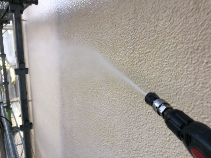 建物に付着した汚れや旧塗膜を落としました。外壁/下塗り