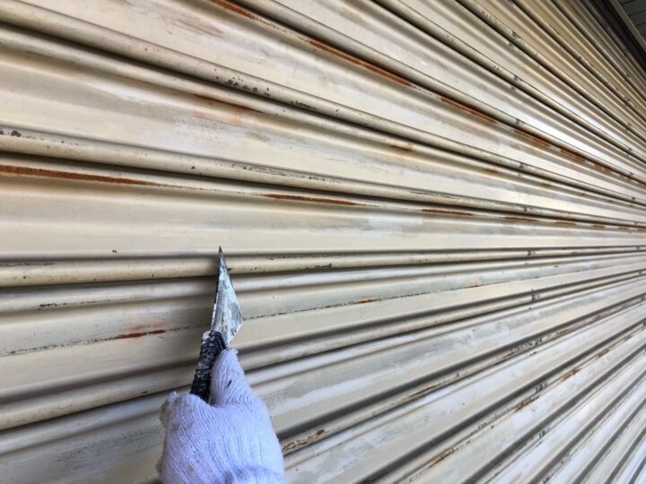 汚れ、サビ、旧塗膜等を落とし塗料の付着をよくするための作業を行いました。シャッター/錆止め