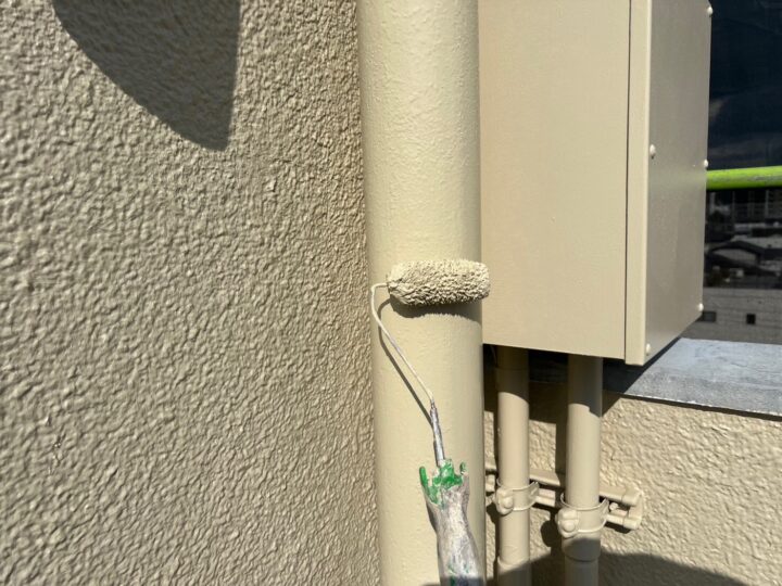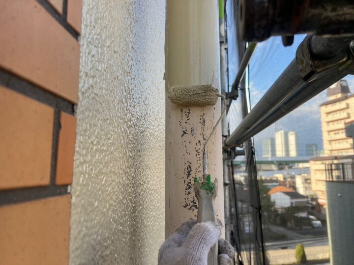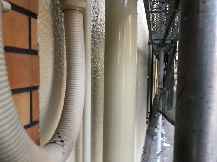 上塗り材を塗布する工程です。これで塗装の工程は完了です。竪樋/施工完了