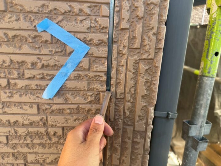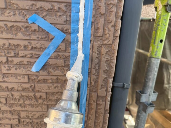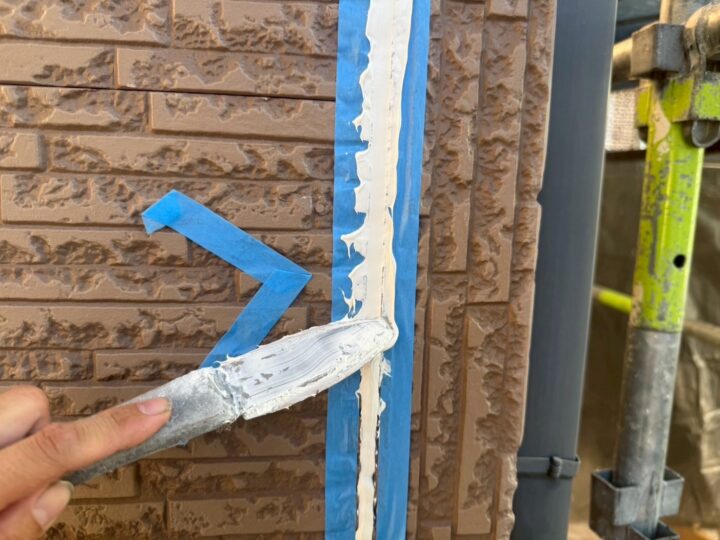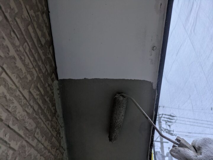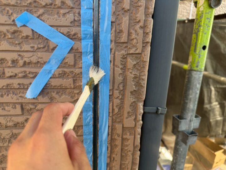 下地材とシーリング材の密着性を良くする為にプライマー施工をしています。シーリング/充填