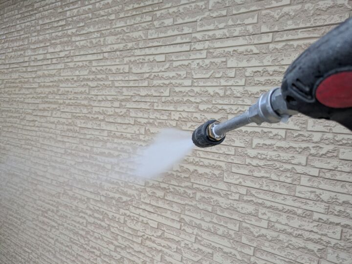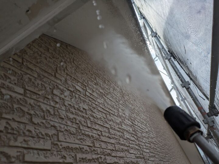 建物に付着した汚れや旧塗膜を落としました。外壁/下塗り