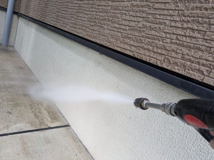 建物に付着した汚れや旧塗膜を落としました。基礎/下塗り