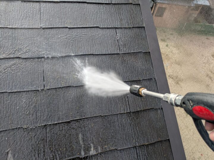 建物に付着した汚れや旧塗膜を落としました。屋根/下塗り