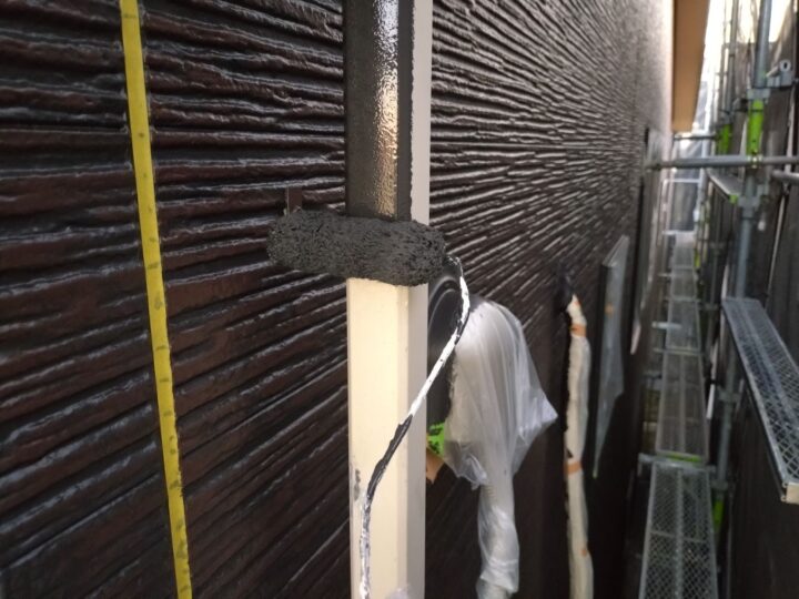 下地材とシーリング材の密着性を良くする為にプライマー施工をしています。シーリング/充填
