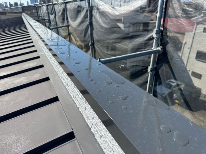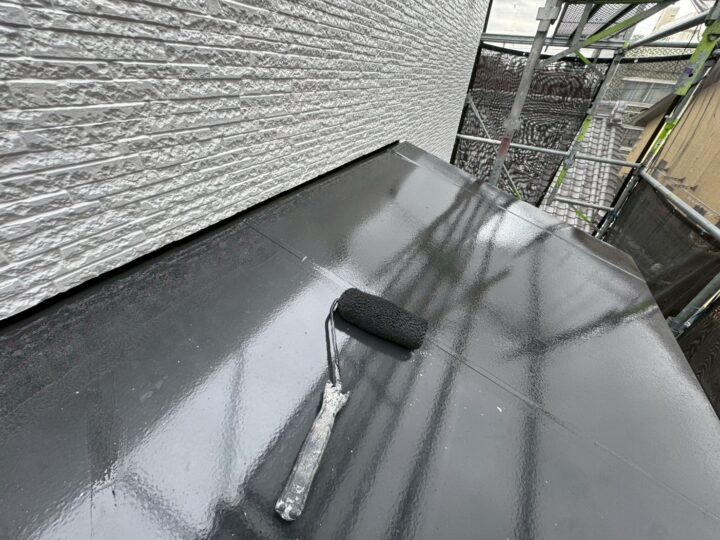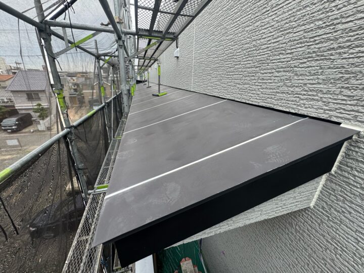 上塗り材を塗布する工程です。これで塗装の工程は完了です。庇板金/施工完了