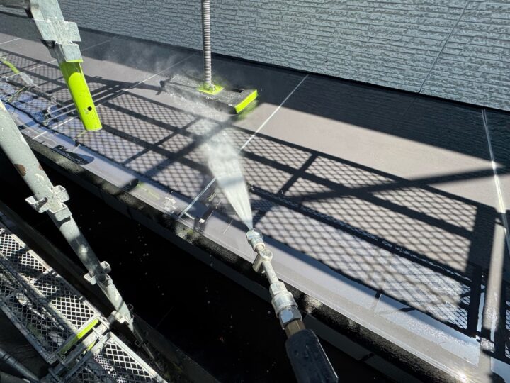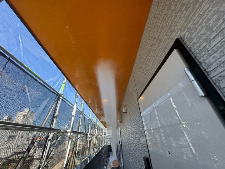 建物に付着した汚れや旧塗膜を落としました。軒天/中塗り