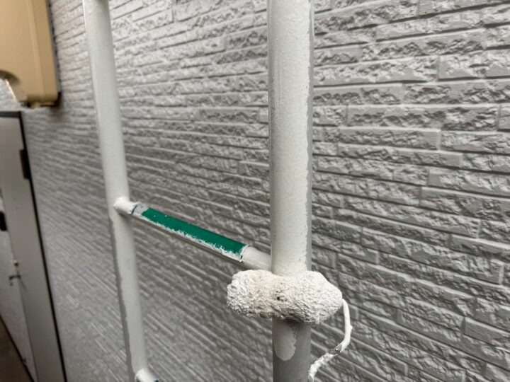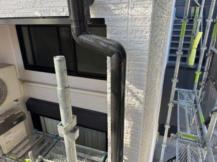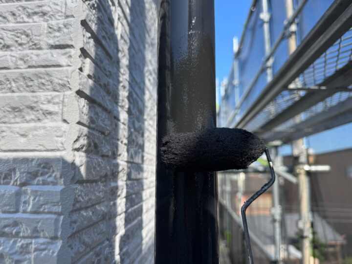 上塗り材を塗布する工程です。これで塗装の工程は完了です。竪樋/施工完了