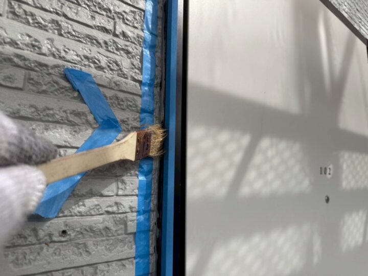 下地材とシーリング材の密着性を良くする為にプライマー施工をしています。シーリング/充填