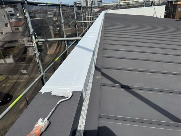 中塗り材を塗布する工程です。庇板金/上塗り