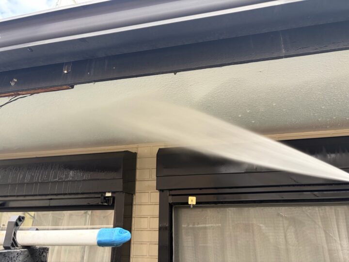 建物に付着した汚れや旧塗膜を落としました。軒天/中塗り