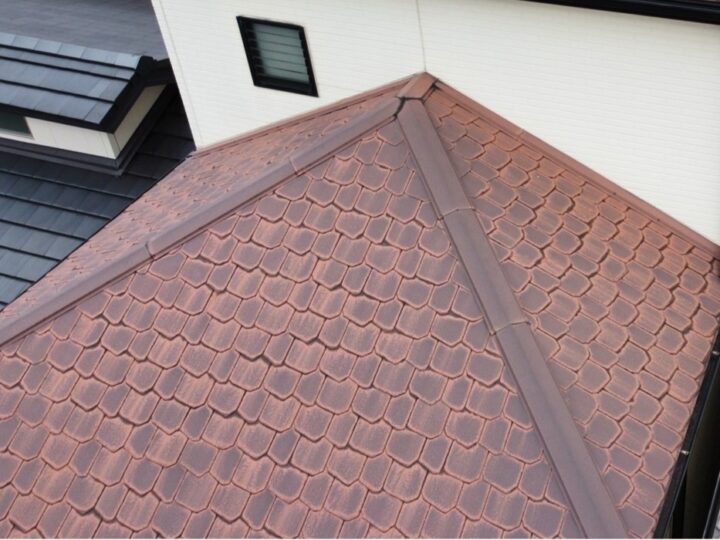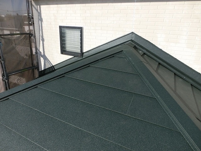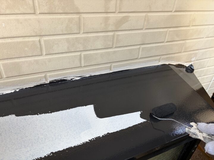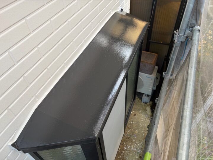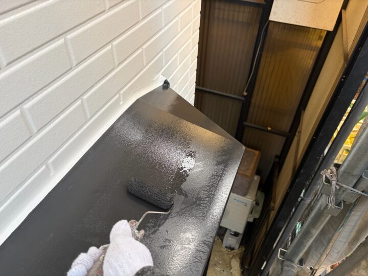 上塗り材を塗布する工程です。これで塗装の工程は完了です。庇板金/施工完了