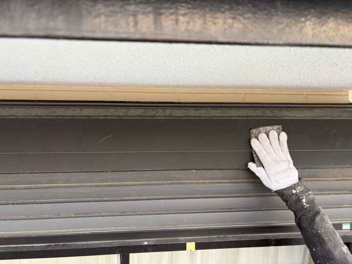 汚れ、サビ、旧塗膜等を落とし塗料の付着をよくするための作業を行いました。シャッターボックス/錆止め