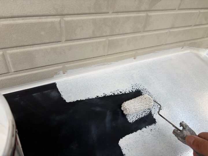 上塗り材を塗布する工程です。これで塗装の工程は完了です。水切り/施工完了