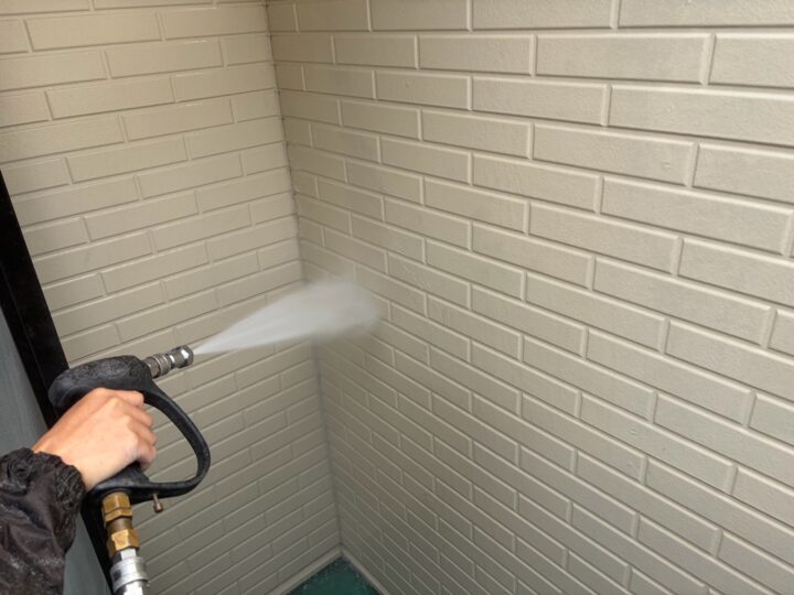建物に付着した汚れや旧塗膜を落としました。外壁/下塗り