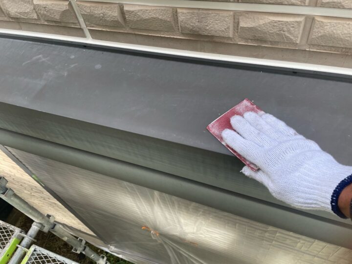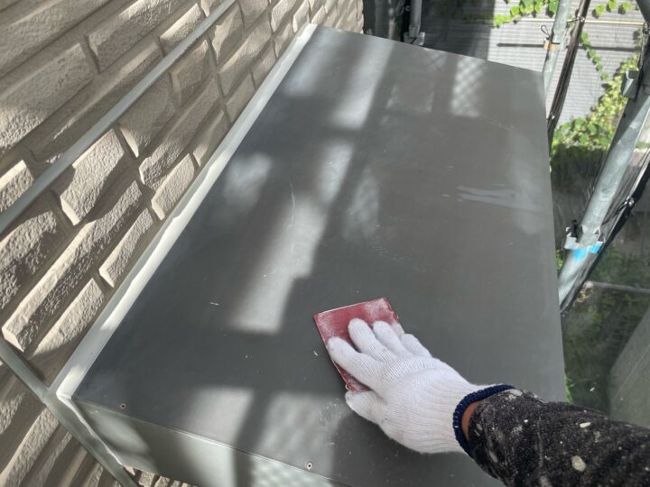 汚れ、サビ、旧塗膜等を落とし塗料の付着をよくするための作業を行いました。庇/錆止め