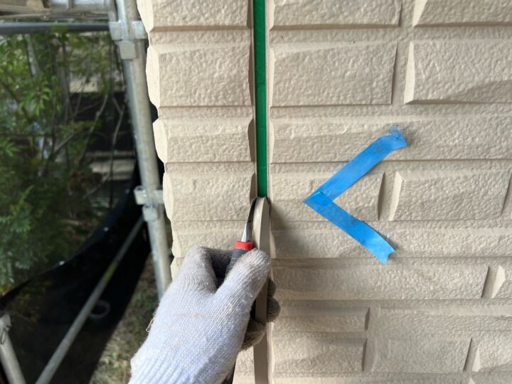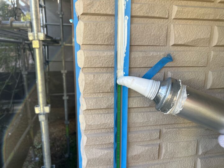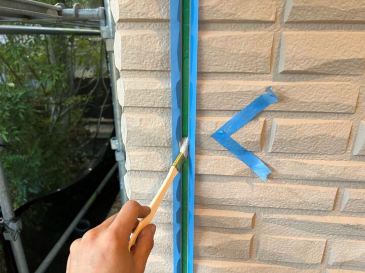 下地材とシーリング材の密着性を良くする為にプライマー施工をしています。シーリング/充填
