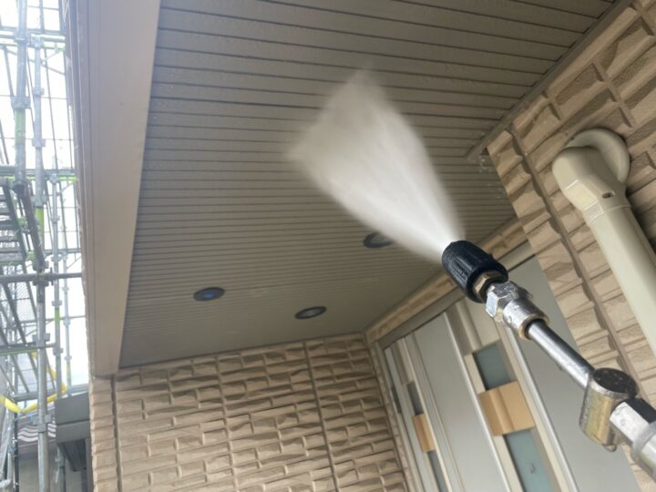 建物に付着した汚れや旧塗膜を落としました。軒天/中塗り