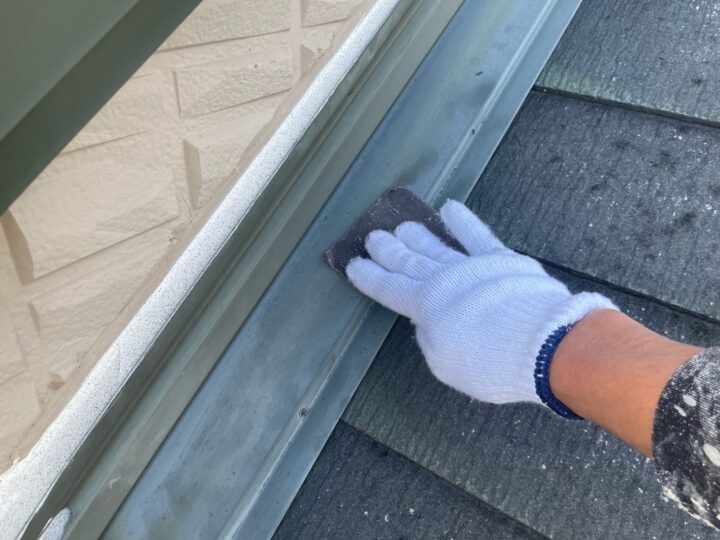 汚れ、サビ、旧塗膜等を落とし塗料の付着をよくするための作業を行いました。屋根板金/錆止め