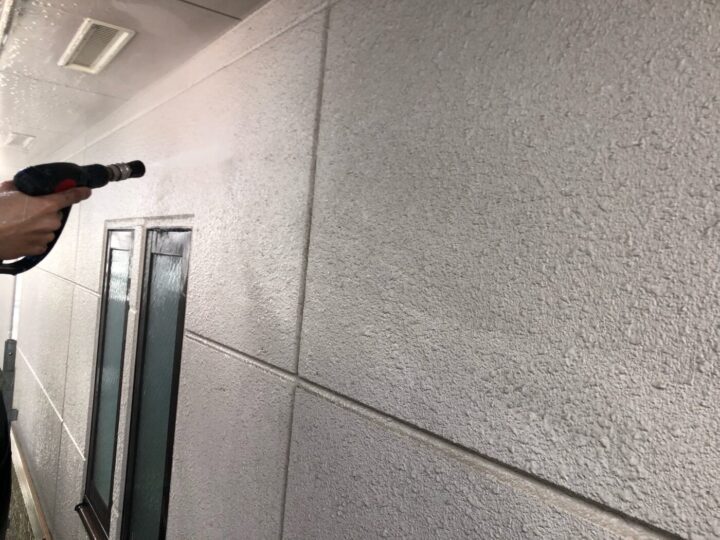 建物に付着した汚れや旧塗膜を落としました。外壁/下塗り
