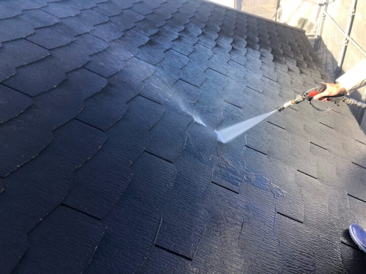 建物に付着した汚れや旧塗膜を落としました。屋根/下塗り