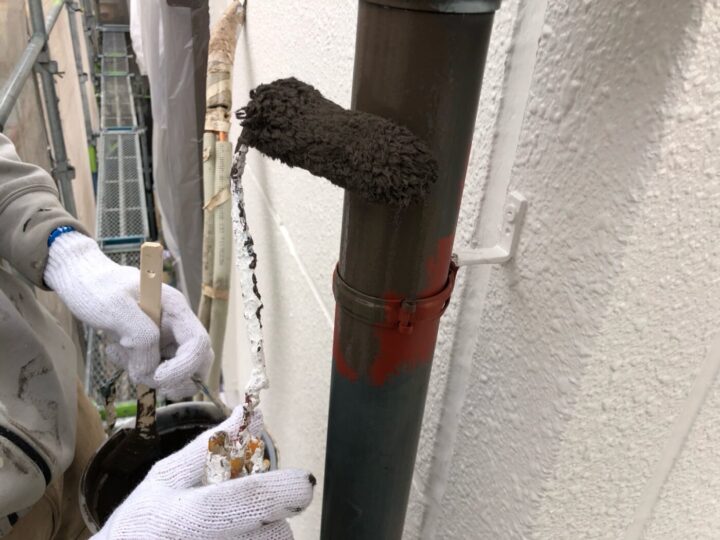 上塗り材を塗布する工程です。これで塗装の工程は完了です。竪樋/中塗り
