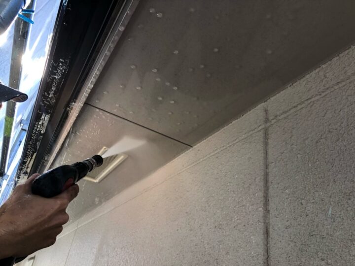 建物に付着した汚れや旧塗膜を落としました。軒天/中塗り