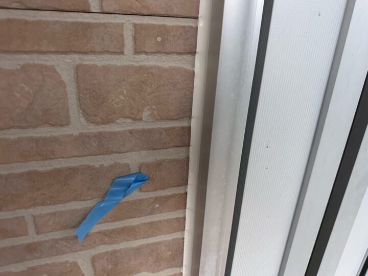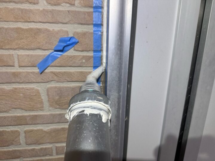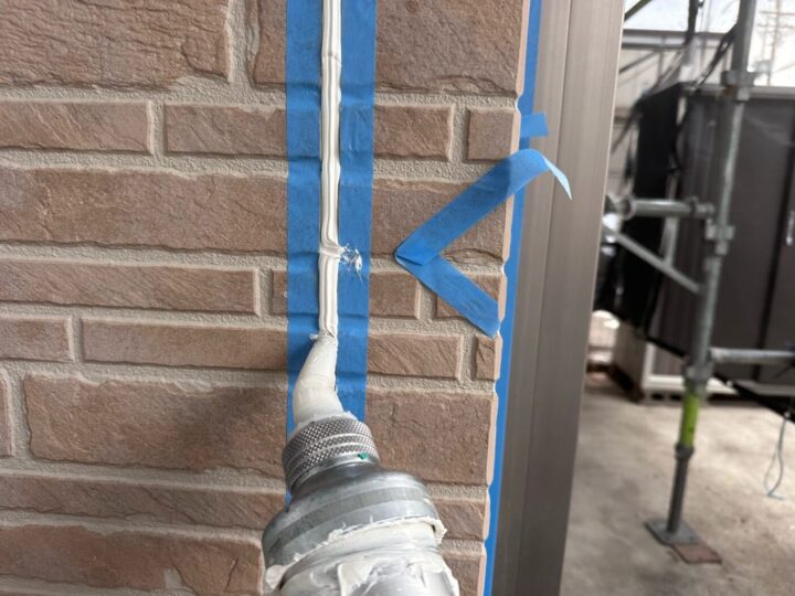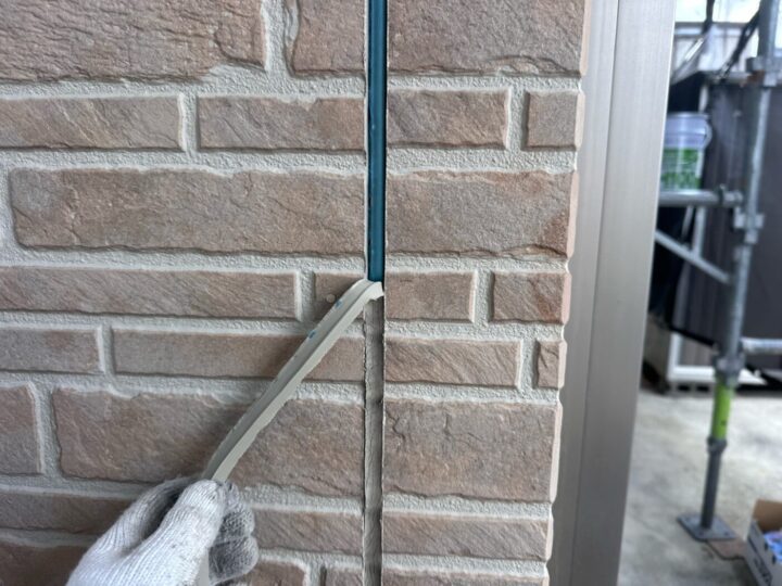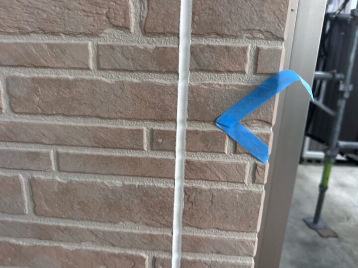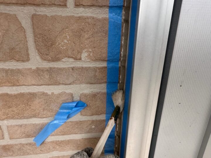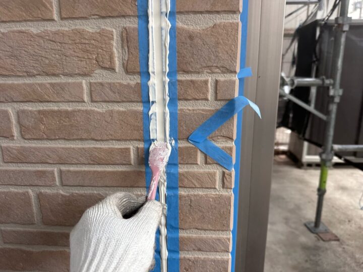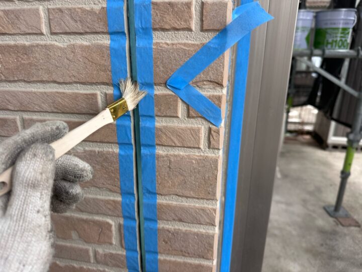 下地材とシーリング材の密着性を良くする為にプライマー施工をしています。シーリング/充填