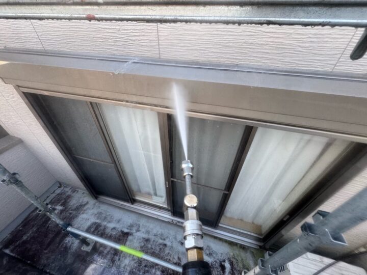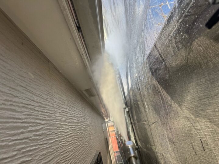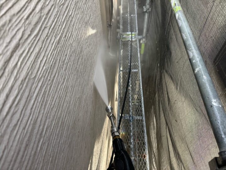 建物に付着した汚れや旧塗膜を落としました。外壁/下塗り