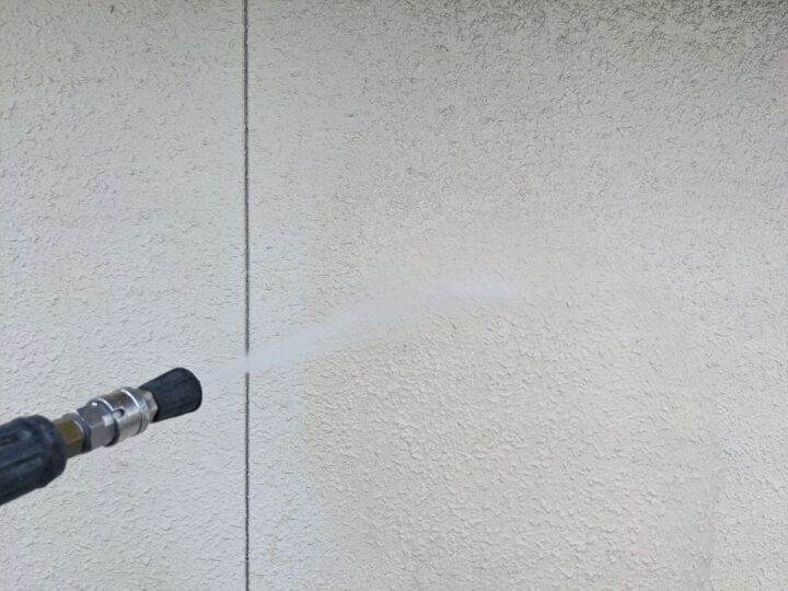 高圧洗浄/建物に付着した汚れや旧塗膜を落としました。