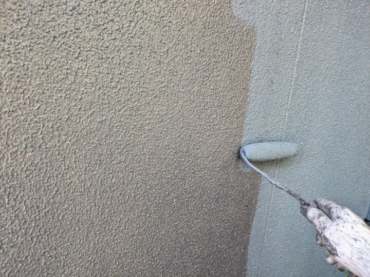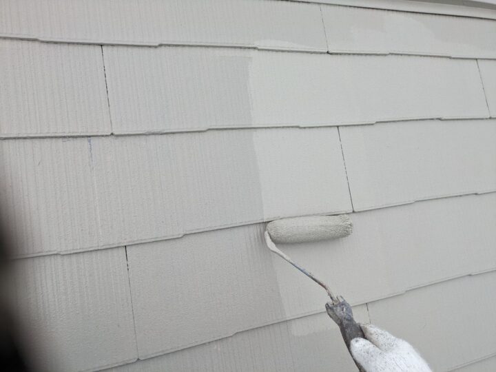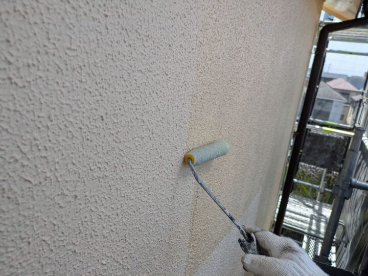 軒天中塗り/中塗り材を塗布する工程です。
