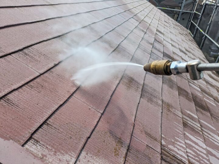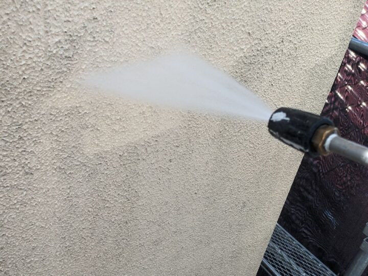 高圧洗浄/建物に付着した汚れや旧塗膜を落としました。