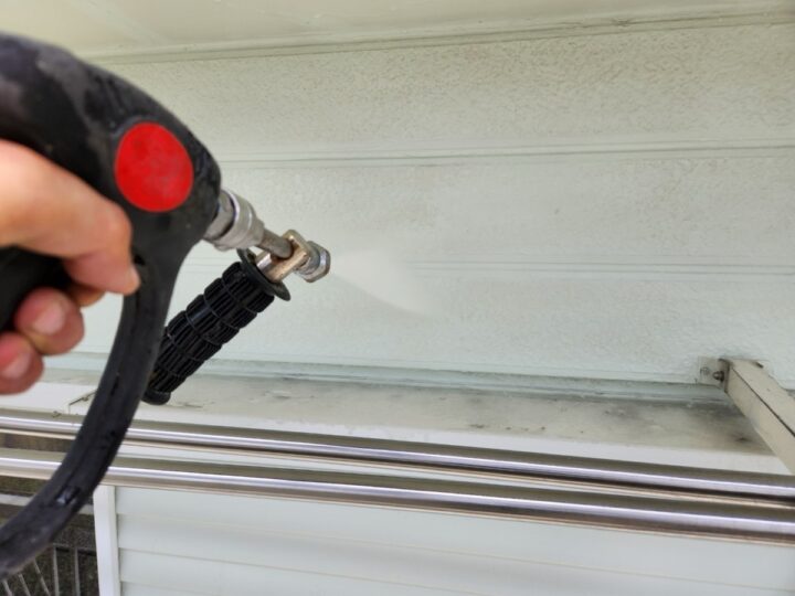 高圧洗浄/建物に付着した汚れや旧塗膜を落としました。