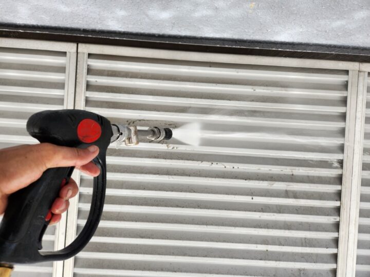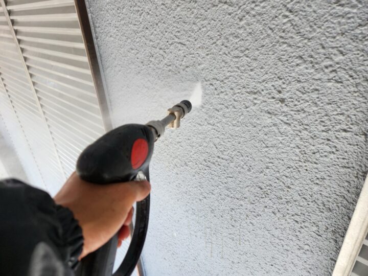 高圧洗浄/建物に付着した汚れや旧塗膜を落としました。